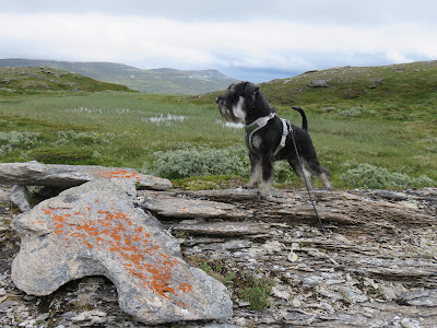 Vaknar upp och regnet öser ner. Kul. Men det ser ut att bli mycket bättre efter lunch så det fick bli en tur då istället. Ville ju såklart upp på fjället men alla regntunga moln skulle skymma all den milsvida utsikten =( Att gå nere i dalen var inte ett alternativ med alla mygg så det fick bli en tur upp ändå. Gick uppför skidbacken vid Torkilstöten (skidbackar är gjorda för att åka nerför, inte gå uppför puh). Väl uppe var det fint och planen var att följa leden mot Helags (alltså inte den klassiska som går från Kläppen). Men den såg så tråkig ut och Helags var dolt i moln så vi gick fritt över fjället istället. Det var fint och lättvandrat. Regnskurarna kom och gick men inget ihållande i all fall. Och myggen blåste bort! Här uppe kan man lätt göra sina egna turer i det oändliga, mängder av små toppar och dalar och sjöar att utforska. Såklart var vi tvungna att gå upp på Torkilstötens högsta punkt =)