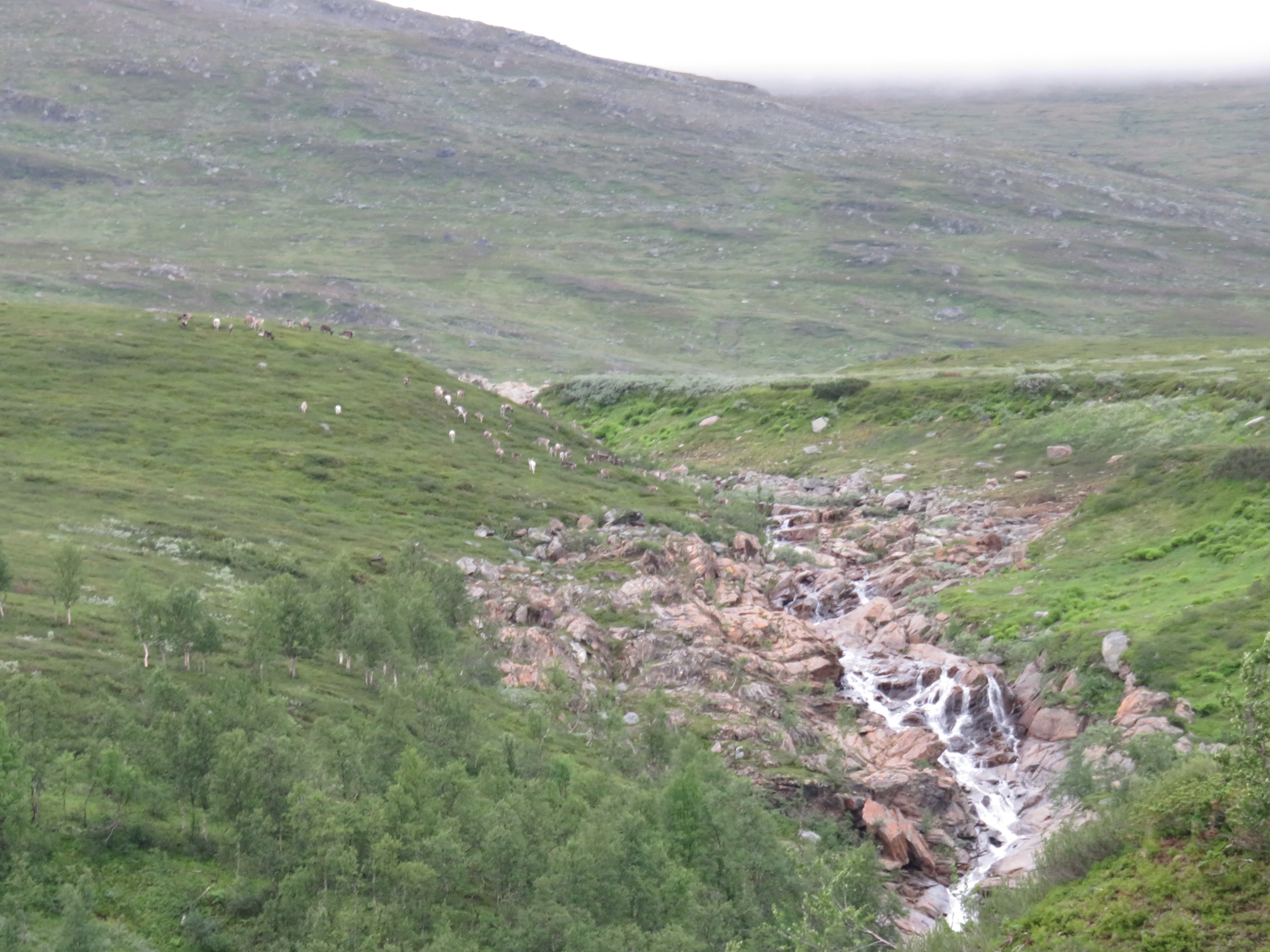 Här var det mygg (men inte mycket knott) så dränkta i myggmedel startade vi tidigt på morgonen och gick upp genom fjällbjörkskogen. Uppåt, uppåt, uppåt... Puh, ryggsäcken var tung med allt vatten och jag funderade över hur fan jag skulle orka upp på toppen när vi inte ens var inne i skalet ännu.